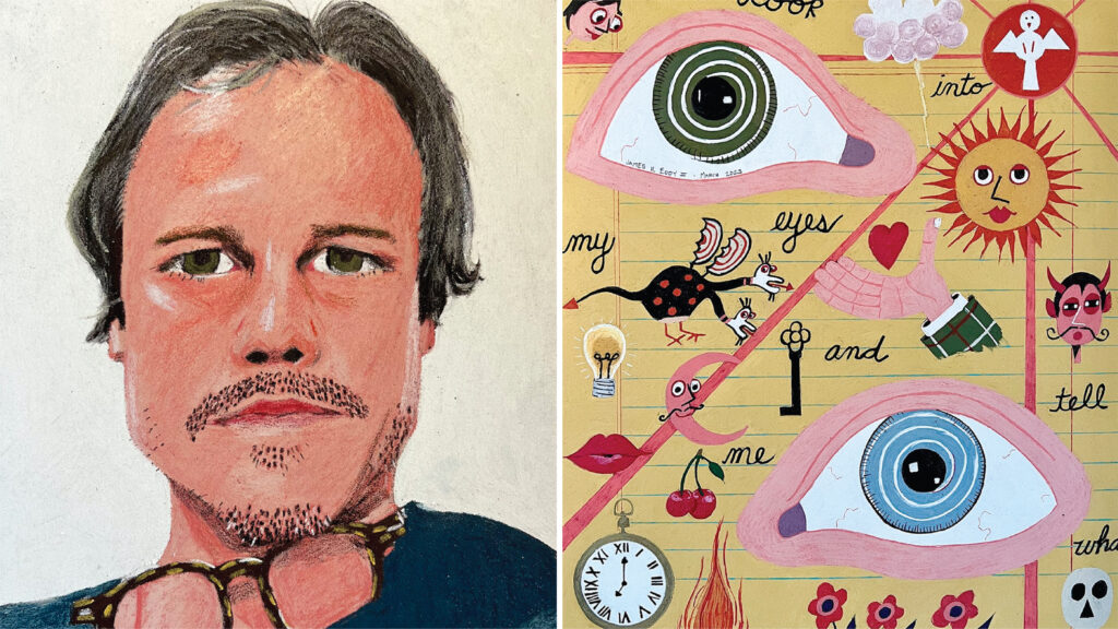 Brown-black sandpaper, soft pastel pencils, and the shimmer of devotional art converge in the studio of Lafayette artist James Eddy. His pieces—vivid, retablo-inflected scenes rendered on industrial materials—feel both raw and reverent, quietly bridging folk tradition and contemporary design.