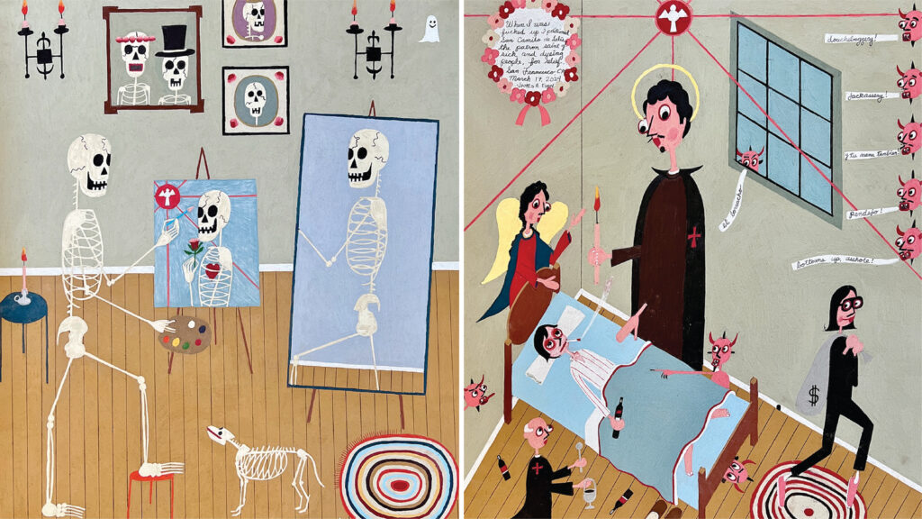 Now an expert on ex-votos, Eddy sells them through his gallery, Divers, online and by appointment in San Francisco, where visitors can also find his own richly textured works on cotton-backed aluminum oxide sandpaper. “My mother is an artist, and she introduced me to sandpaper,” he says. He buys large rolls made for industrial belt sanders, cuts them into big sheets, and painstakingly covers each with a pale ground before layering in his graphically arresting and sometimes provocative compositions.