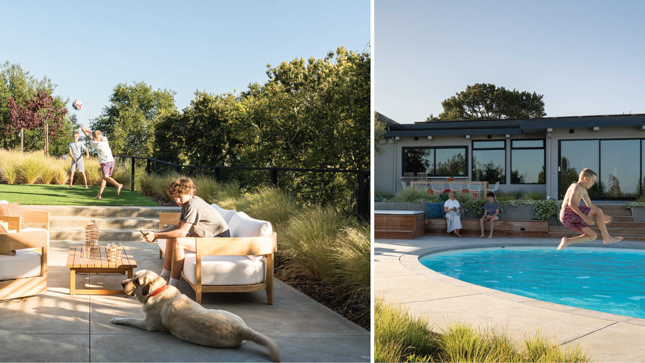 New plantings such as California poppy, yarrow, and forest pansy were part of landscape architect Gretchen Whittier’s strategy for landscaping with “a more native feel, as opposed to the Japanese theme of the original design. Trees were added to the patio to provide shade from the afternoon heat, she says.