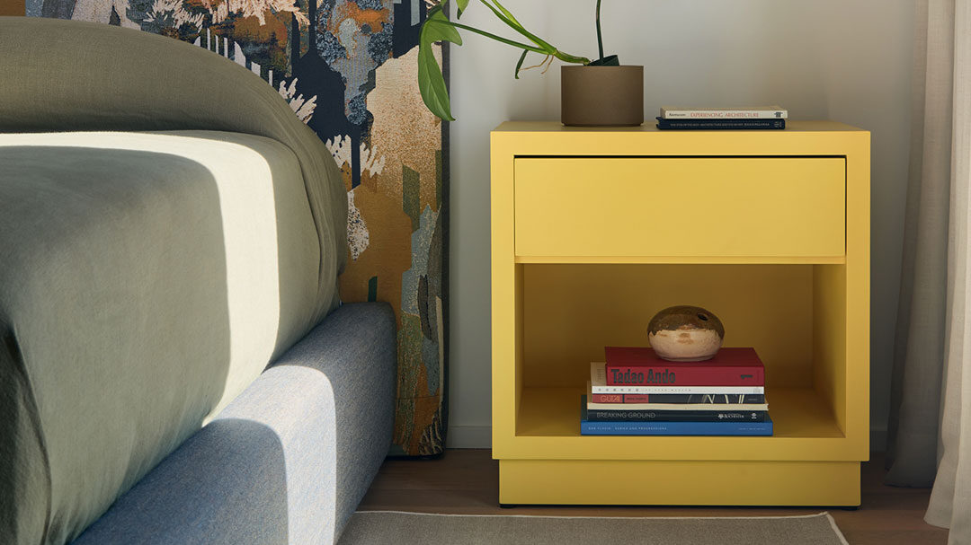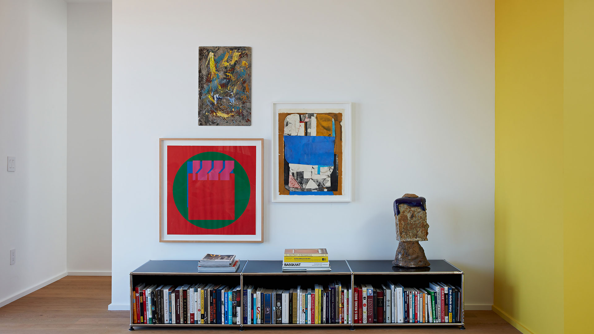 As a result of the collaboration, the nondescript 1950s building has been transformed into a modern gem, worthy of inclusion in the 2024 American Institute of Architects San Francisco (AIASF) Home Tours. A curved exterior wall, clad in black Thermory wood that mimics the look of the Japanese charring technique of shou sugi ban, softens the rectilinear architecture. And the front door is “the perfect yellow — welcoming and cheerful,” Lin says. The same hue, Benjamin Moore’s Lemon Grove, covers the hallway accessing both units. Inside hers, a yellow volume contains an elevator, kitchen appliances and pantry space.