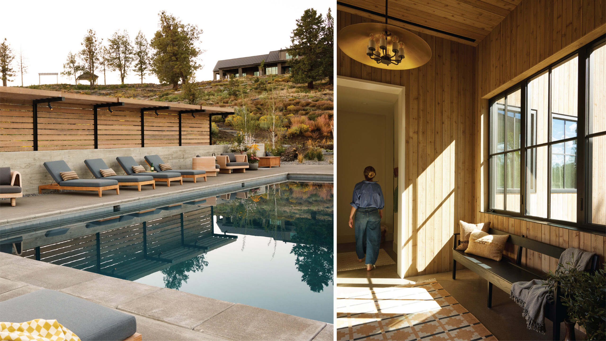 While the architecture for the main house and the recreation barn is similar, the main house interior displays a softer Scandinavian design style and a U-shape plan with outward-facing rooms that look to mountain views. In contrast, the interior for the poolside recreation barn is outfitted with an industrial-style aesthetic that’s surprisingly urban and invites full-time fun.