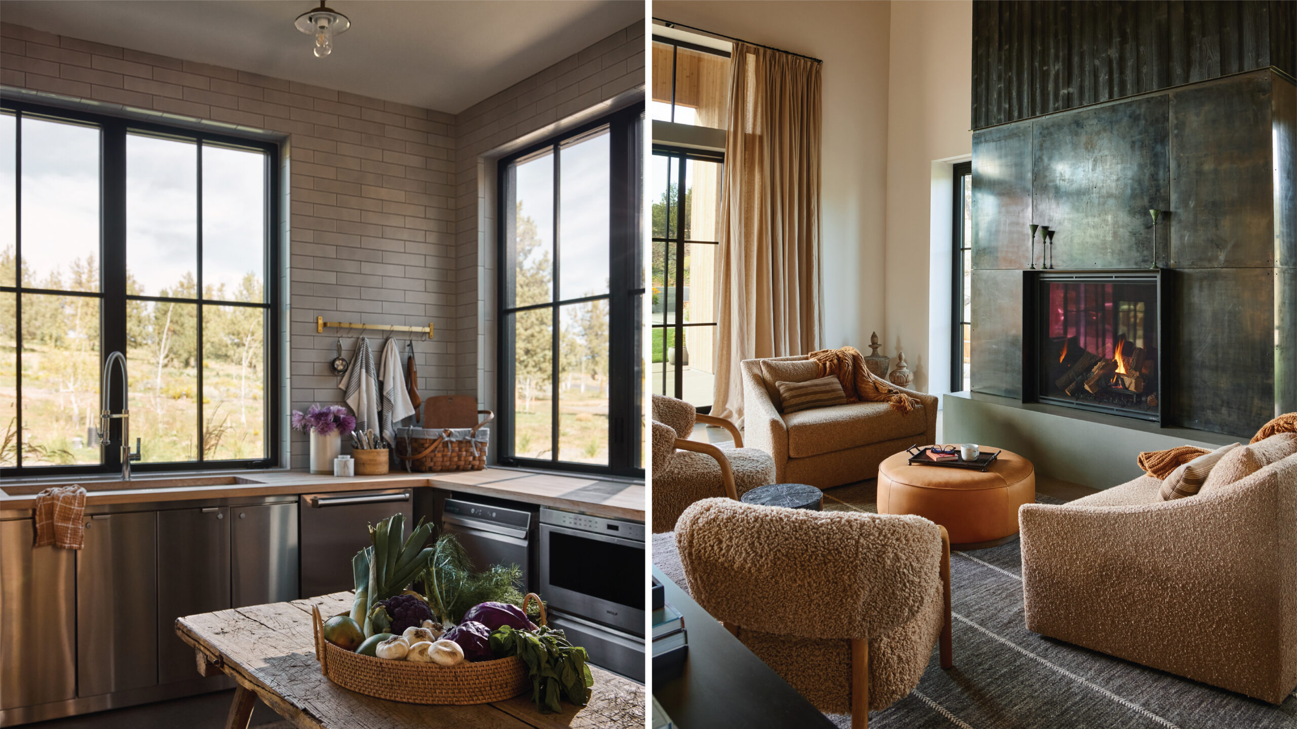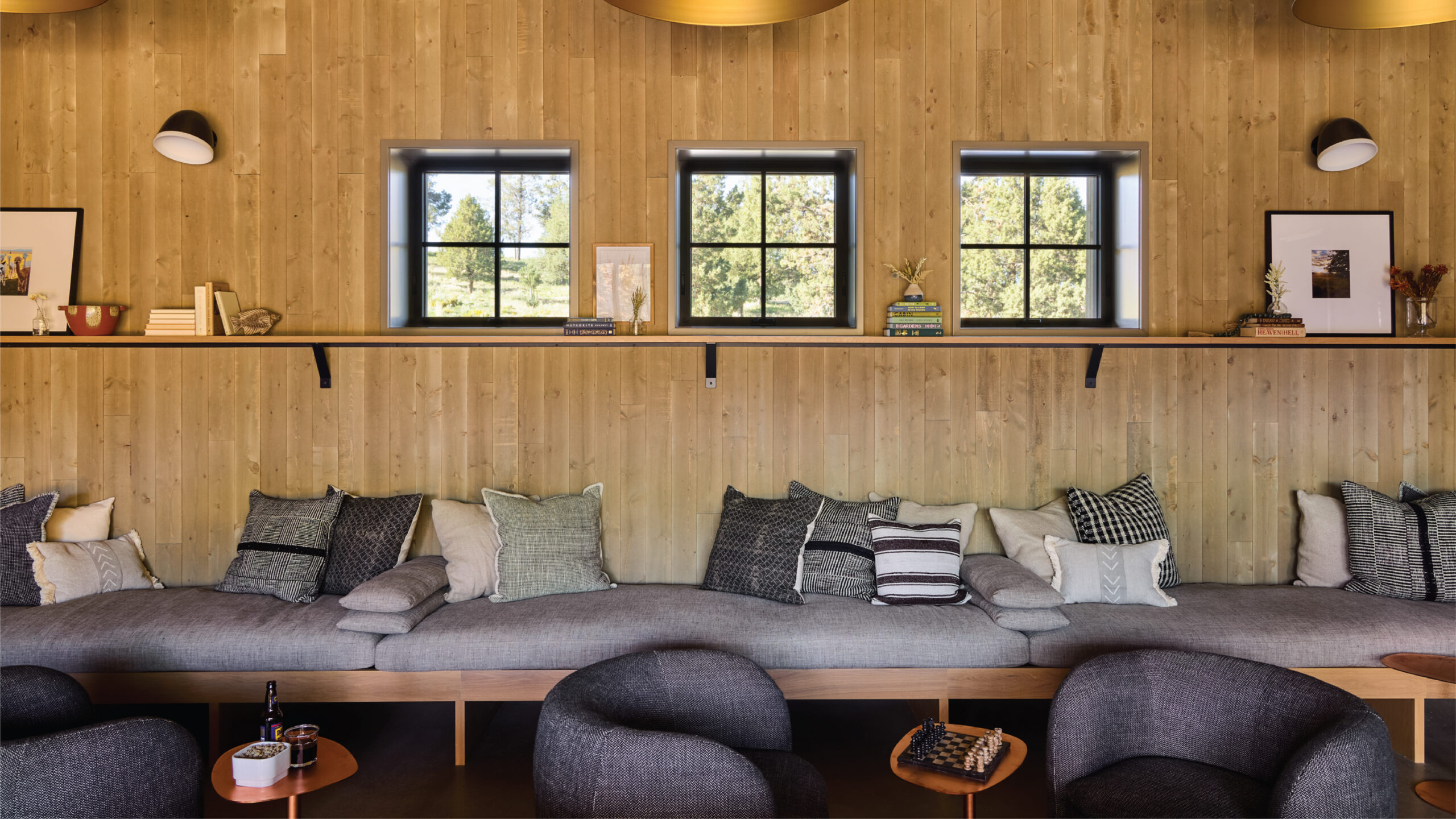 Hawkins installed a built-in alderwood sofa with cushions wrapped in charcoal gray tweed in the recreation barn’s game room, where she hung massive black-and-white portraits on metal of Jimi Hendrix, Dolly Parton, Frank Sinatra, and Hank Williams above a café-style table and leather-and-metal chairs. The great room, located at the opposite end of the barn, features more steel on the fire surround, which is also marked by a concrete hearth and charred wood siding. “Everything is minimalist for simplicity, but there’s a lot of varied texture,” says Hawkins.