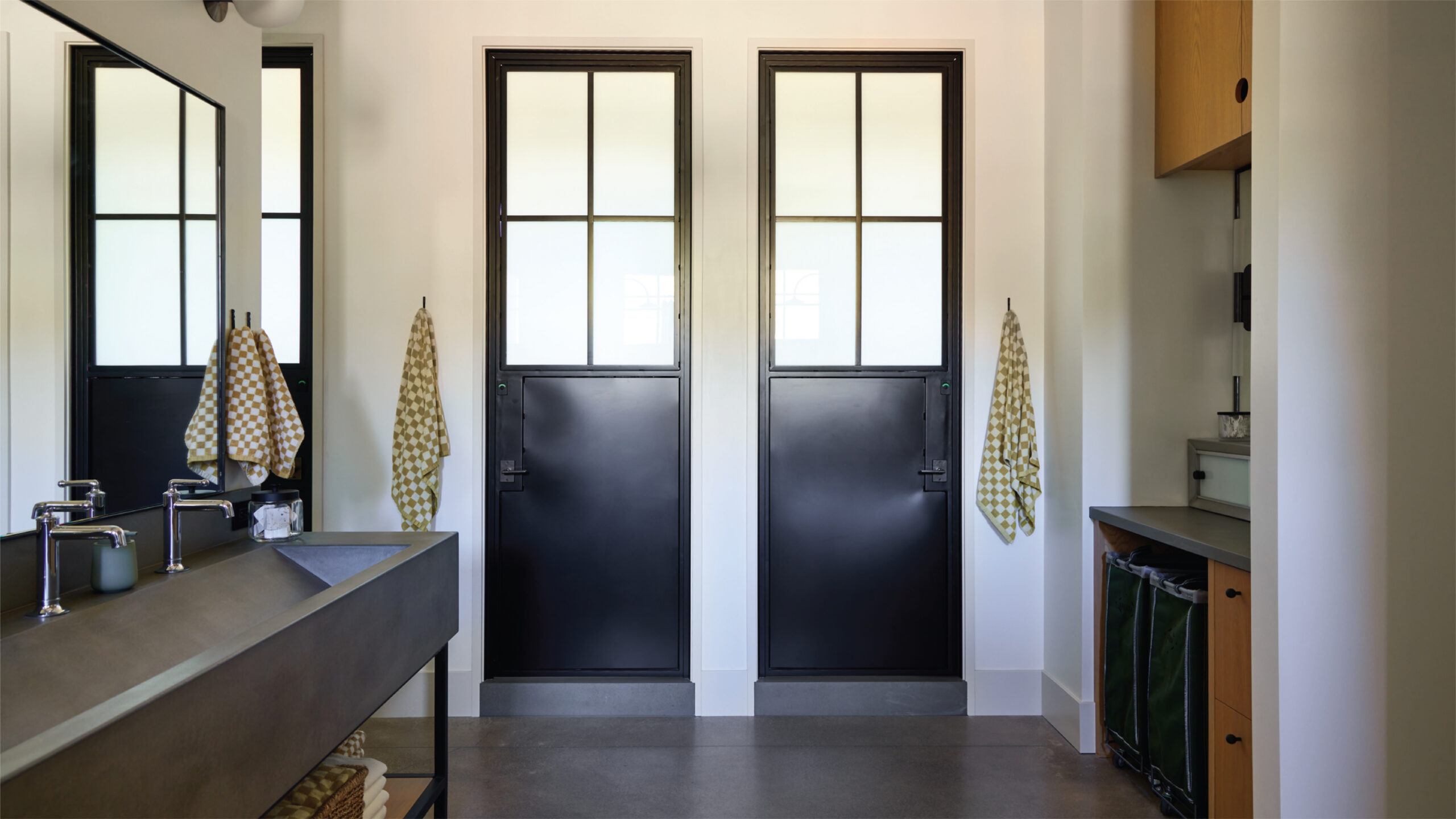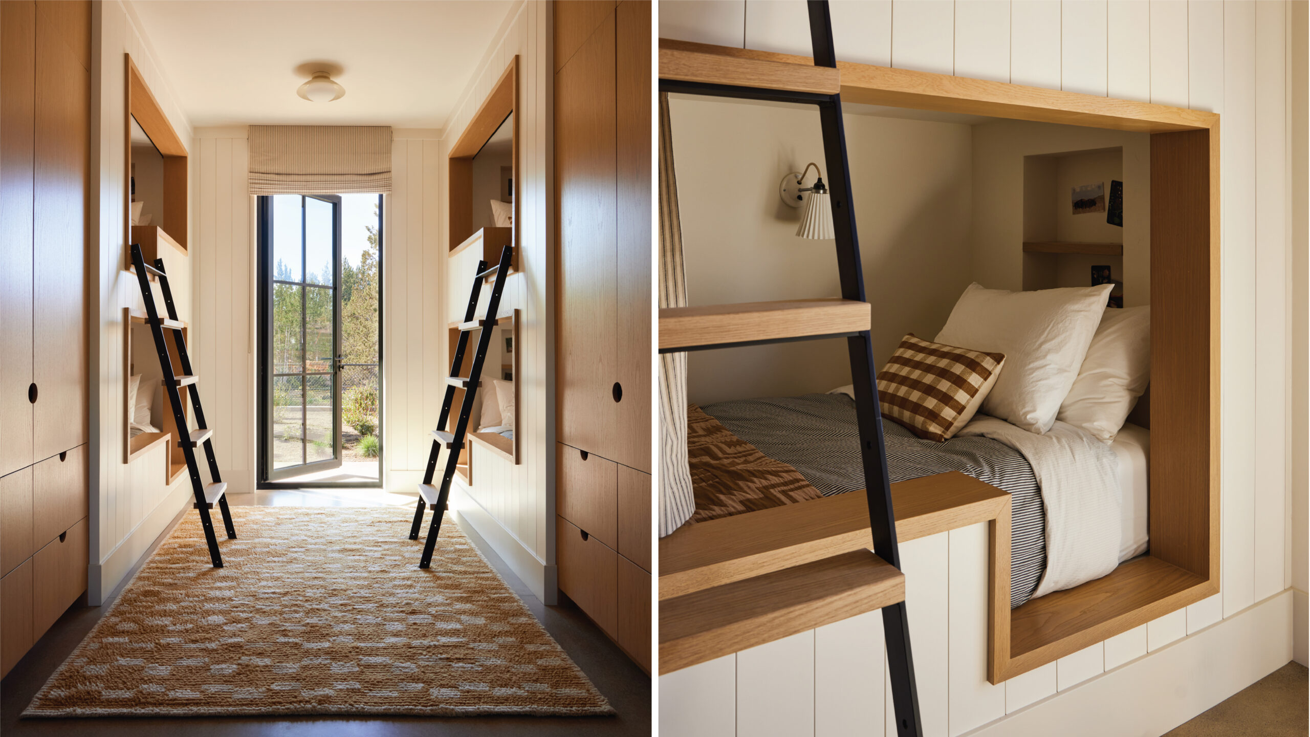 Each of the bunk room’s integrated shiplap bunk beds have reading lights and can be closed off with draperies. “Since this is Oregon, I had to do Pendelton blankets on the beds,” says Hawkins. When it came to the large locker room-style bathroom, the designer chose a custom trough-style poured-concrete sink, more concrete flooring, and steel-and-glass doors that access multiple shower stalls.