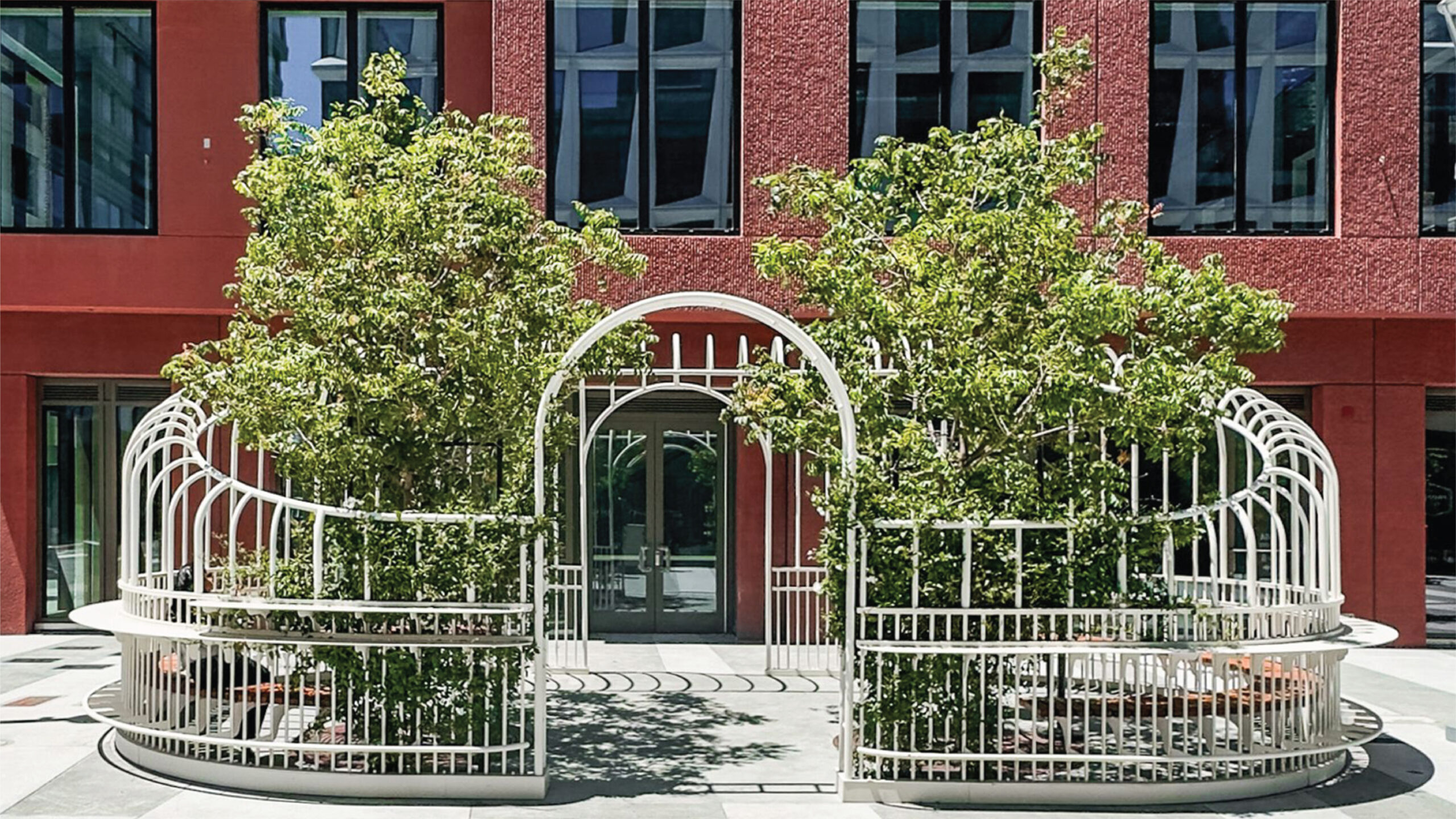 Her artful installation evolved into The Garden Party, an elliptical, white powder-coated tubular steel gazebo bolted onto a base plate. Inspired by latticed Victorian-era conservatories, the modern 378-square-foot enclosure stands 11 feet high and tapers down to 5 feet. Its embracing form, built around existing Chinese pistache trees that change color seasonally, will gradually be enveloped by a lacy star jasmine vine.
