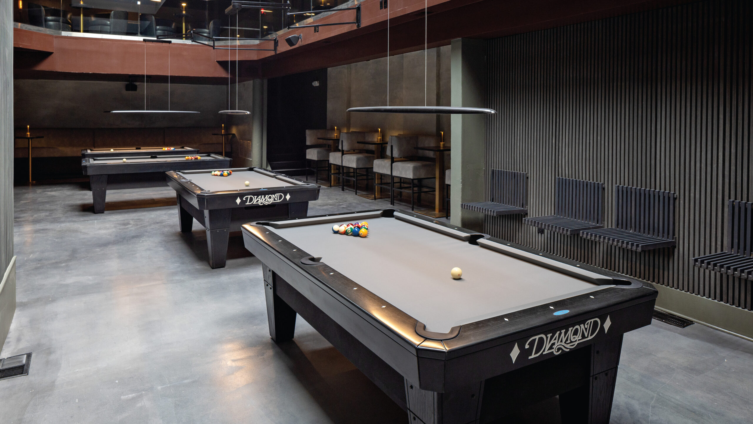 Walters outfitted the venue with eight pool tables, each illuminated by articulated-arm pendant lights, foldable seating for sideliners, upholstered banquettes for fine dining, and a glossy, full-service bar. For a moody atmosphere, he chose a paint palette of burnt umber for the original pressed-tin ceilings, smoky grays and greens for the walls, and added a polished concrete floor. Custom blown-glass bar lights bring in added style.