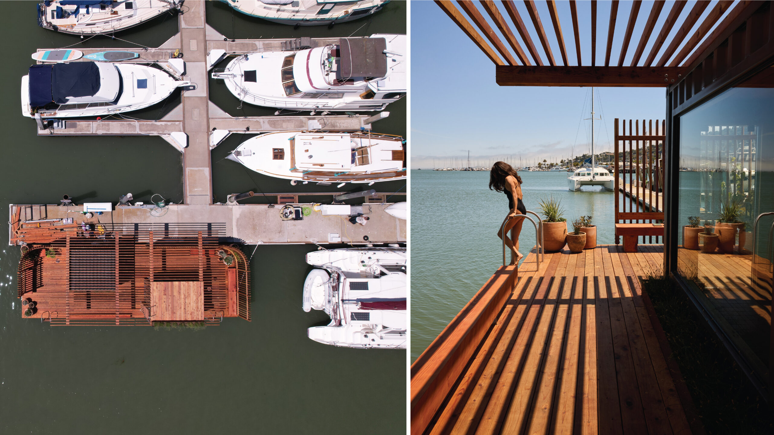 The project almost never left shore. Founders Alex Yenni and Gabriel Turner spent months negotiating with eight regulatory agencies before their vision could float. To give it form, they enlisted San Francisco architect Nick Polansky, who drew on the language of harbors and hulls to design something that felt native to the water.