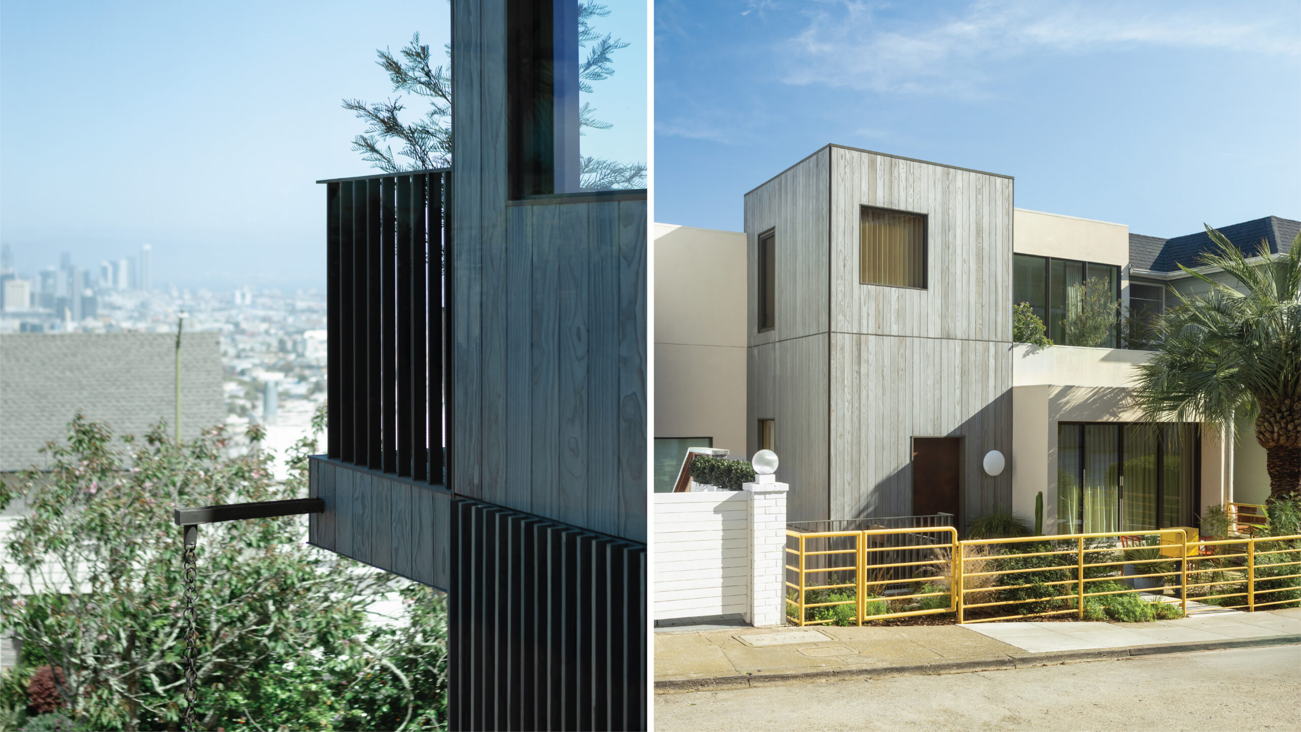 The staircase is capped in brass that will “take on new colors and variations as we run our hands over the railing,” the client says. “Living finishes” were chosen throughout “so that the patinas will age with us.” Similarly, the exterior is clad in a ReSawn Timber Co. material “meant to look like naturally grayed, aged wood,” Curtiss notes. “It will still change over time.”