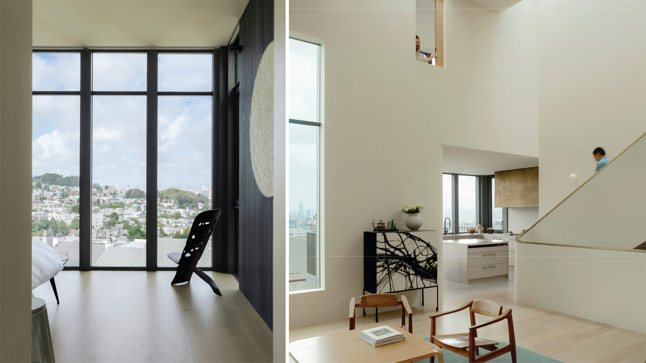 The client initially pictured positioning the living room at the back of the house, where the standard-height kitchen is today. Curtiss suggested making the 18-foot-high volume “more internal,” she says. “It’s not about the city seeing your double-height space; it’s about the daily ritual of moving through it as you go upstairs and down. And then the kitchen sticks out toward the city and the view. It makes the grandness a little quieter.” (The view encompasses downtown San Francisco, the bay and beyond.)