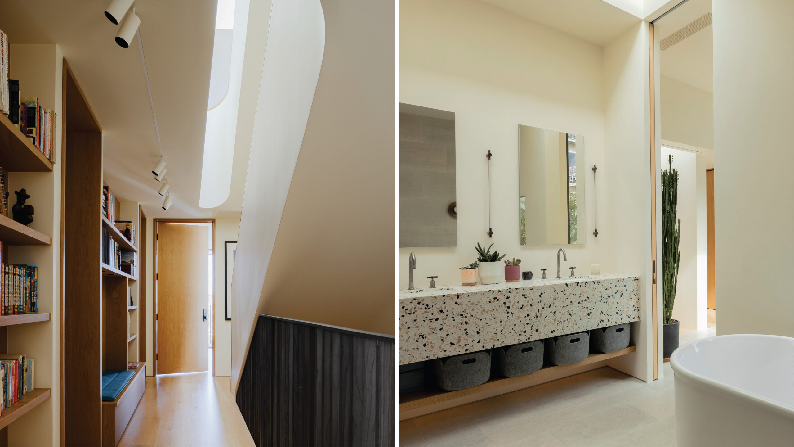 Inspired by that Esherick gem a few miles away, the client desired a spiral staircase. Alas, there was no room for such, prompting a more linear design. Through conversations with Curtiss and Vuong, a striking focal point emerged. “We integrated curves into the stairs,” Curtiss says of the ribbon-like form. “We brought the curve into the overarching design, so it wasn’t a singular moment but almost began to define transitions.”